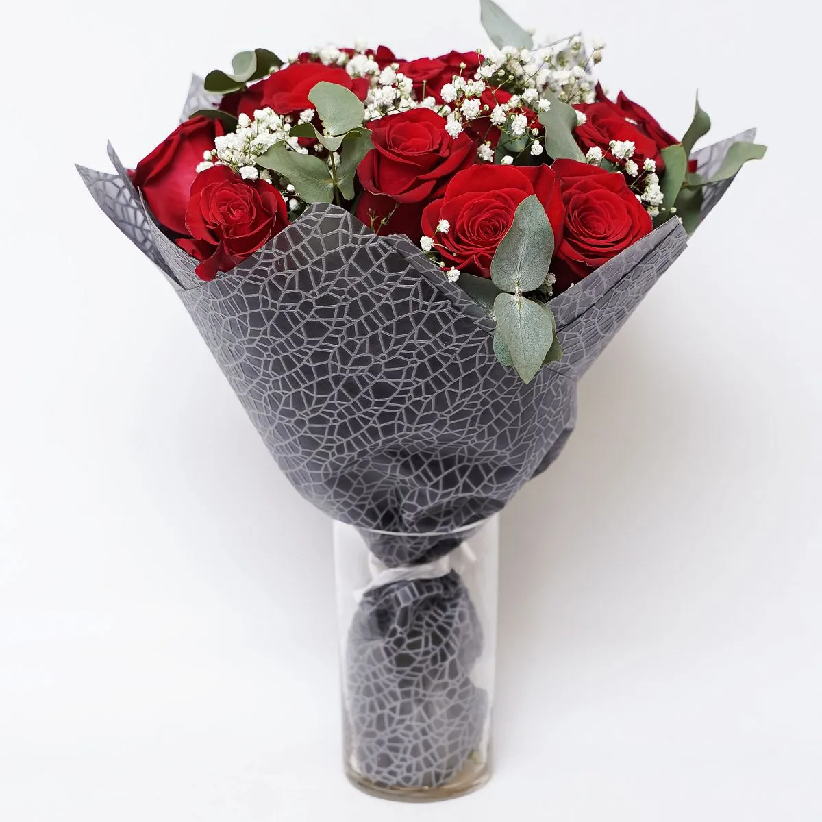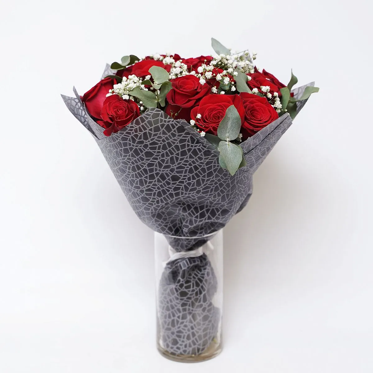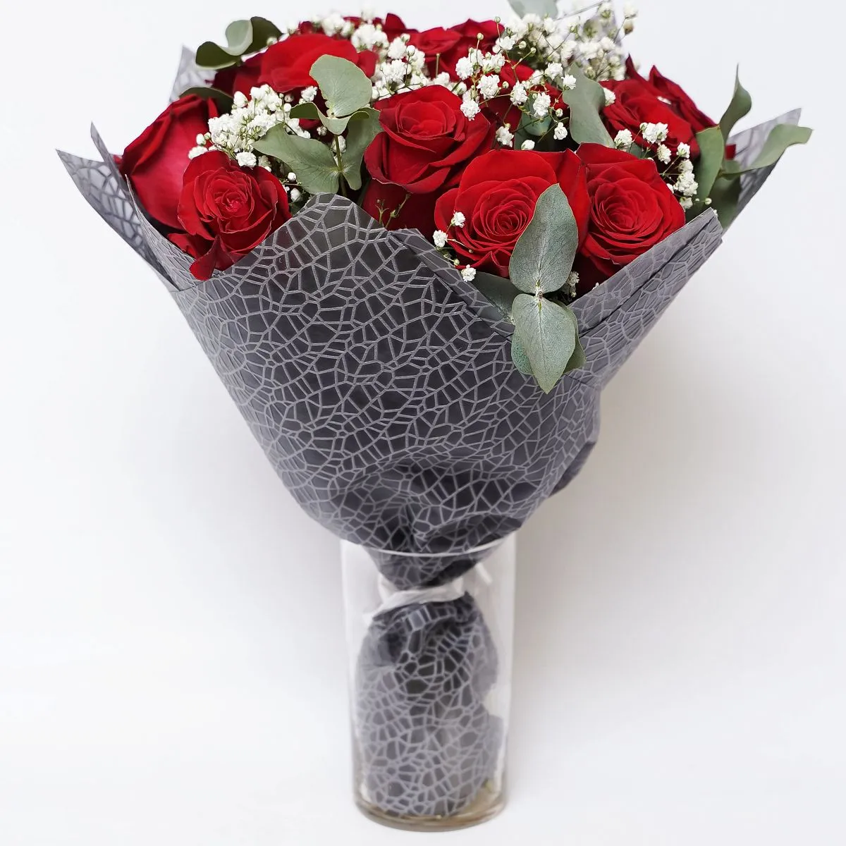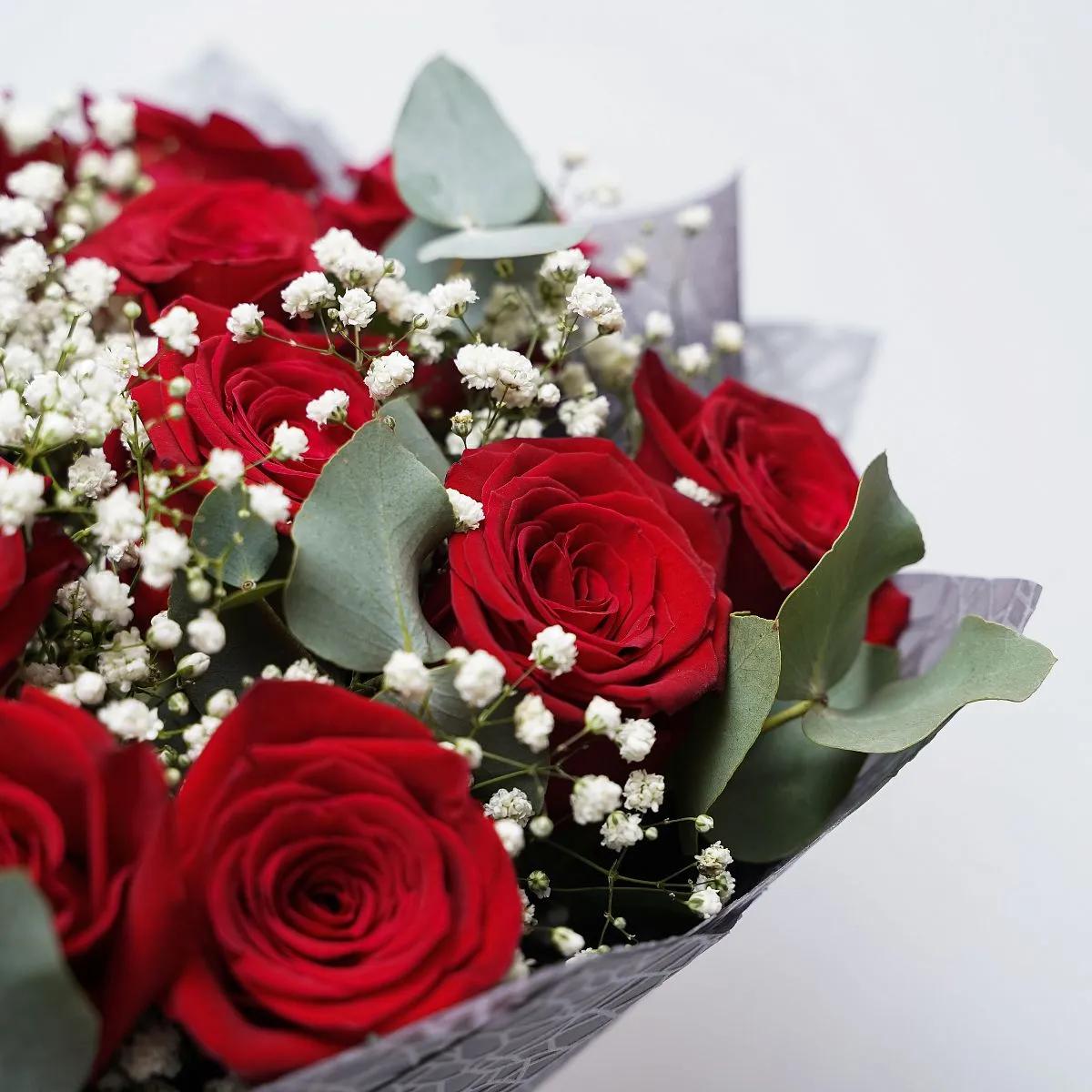 Цветы в составе Гипсофила, Пленка матовая 320 руб, Роза Форевер 50 см, Эвкалипт Де Люкс, Расходный материал, Лента текстиль 100 руб, ✓ Все цветы в наличии