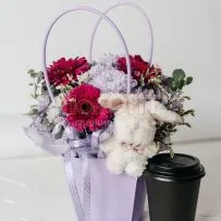 Цветы в составе Гвоздика Одиночная, Гербера, Лимониум Натуральный (Роял), Оазис , Эвкалипт Де Люкс, Декор 600 руб, Мягкая игрушка 1200 руб, Хризантема Кустовая , Расходный материал, Лента текстиль 100 руб, ✓ Все цветы в наличии