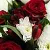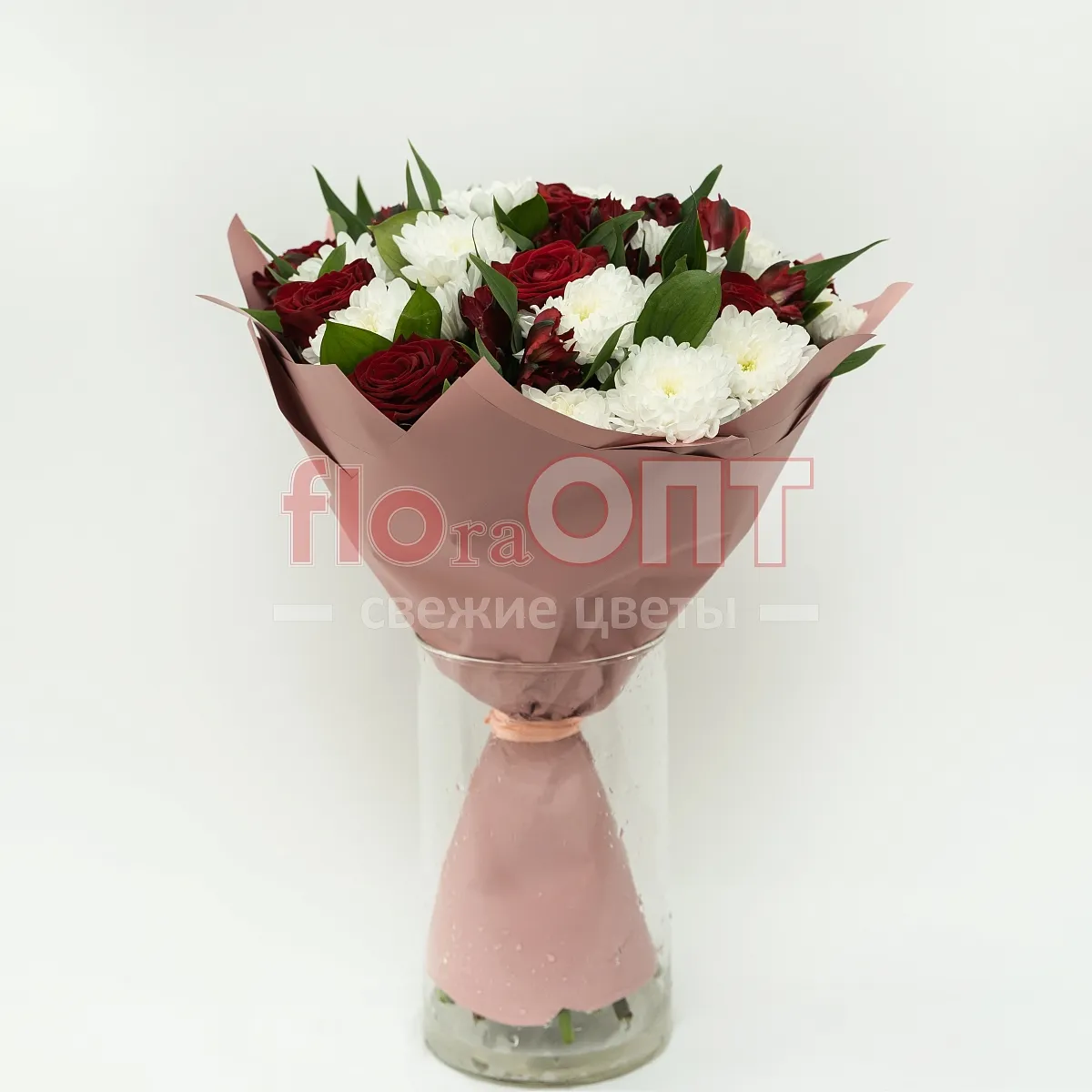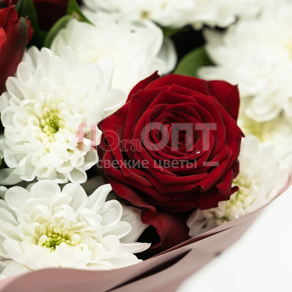 Цветы в составе Альстромерия, Лента пластиковая 30 руб, Пленка 250,руб, Роза Гран При 50 см, Хризантема Кустовая , Расходный материал, ✓ Все цветы в наличии