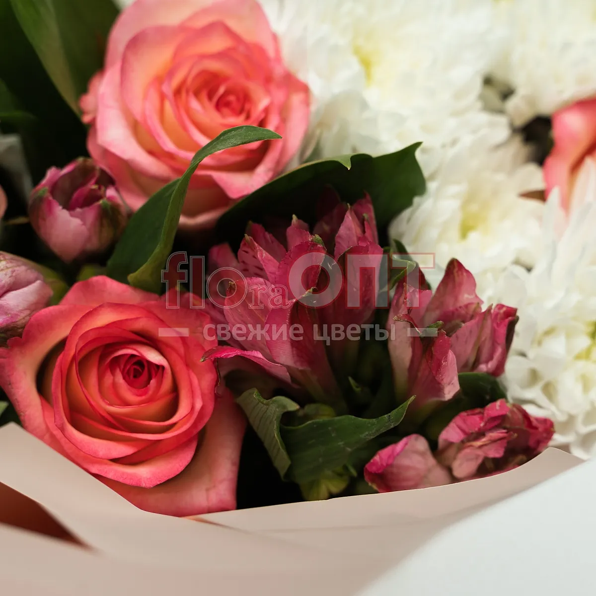 Цветы в составе Альстромерия, Лента пластиковая 30 руб, Пленка 250,руб, Роза Россия 50 см, Хризантема Кустовая , Расходный материал, ✓ Все цветы в наличии