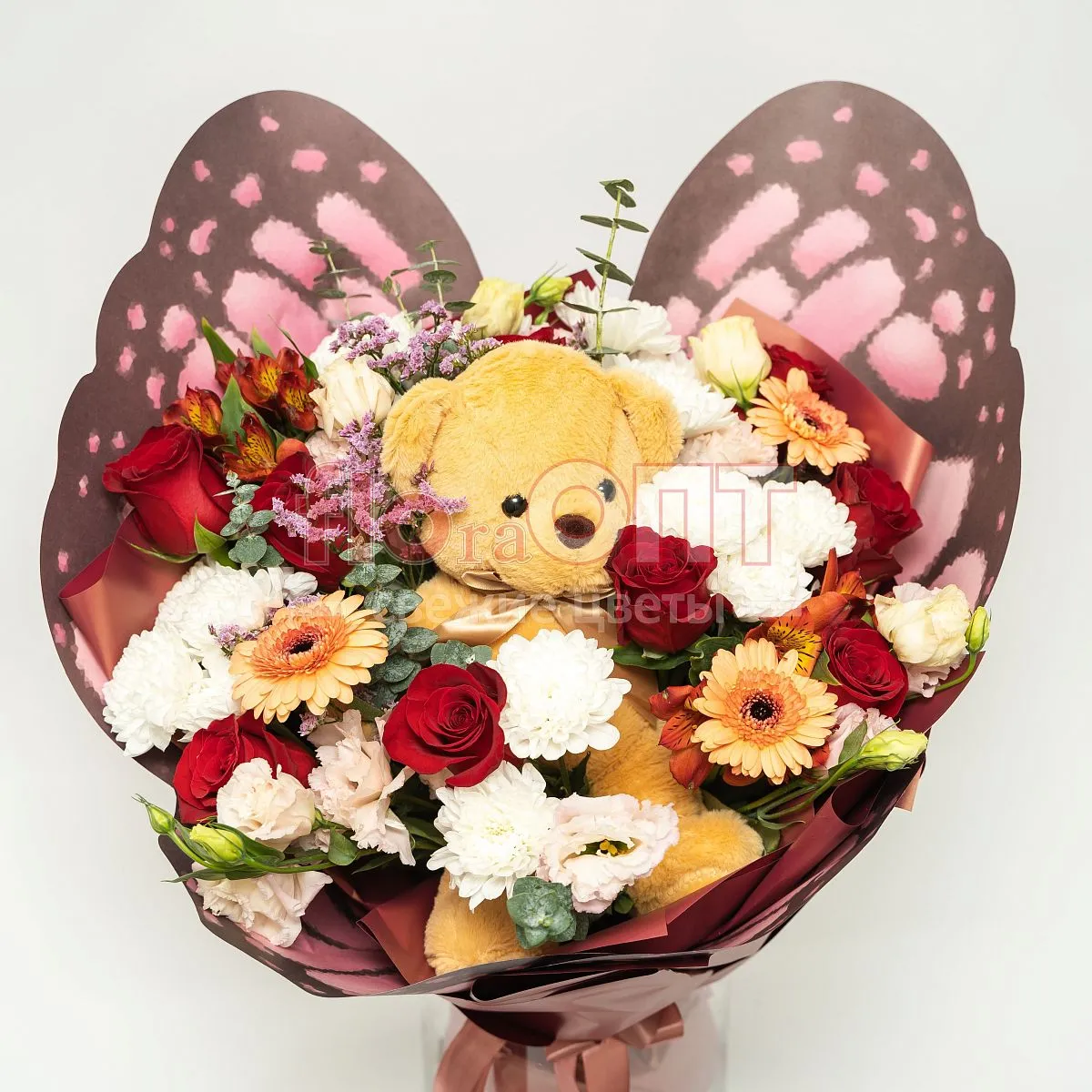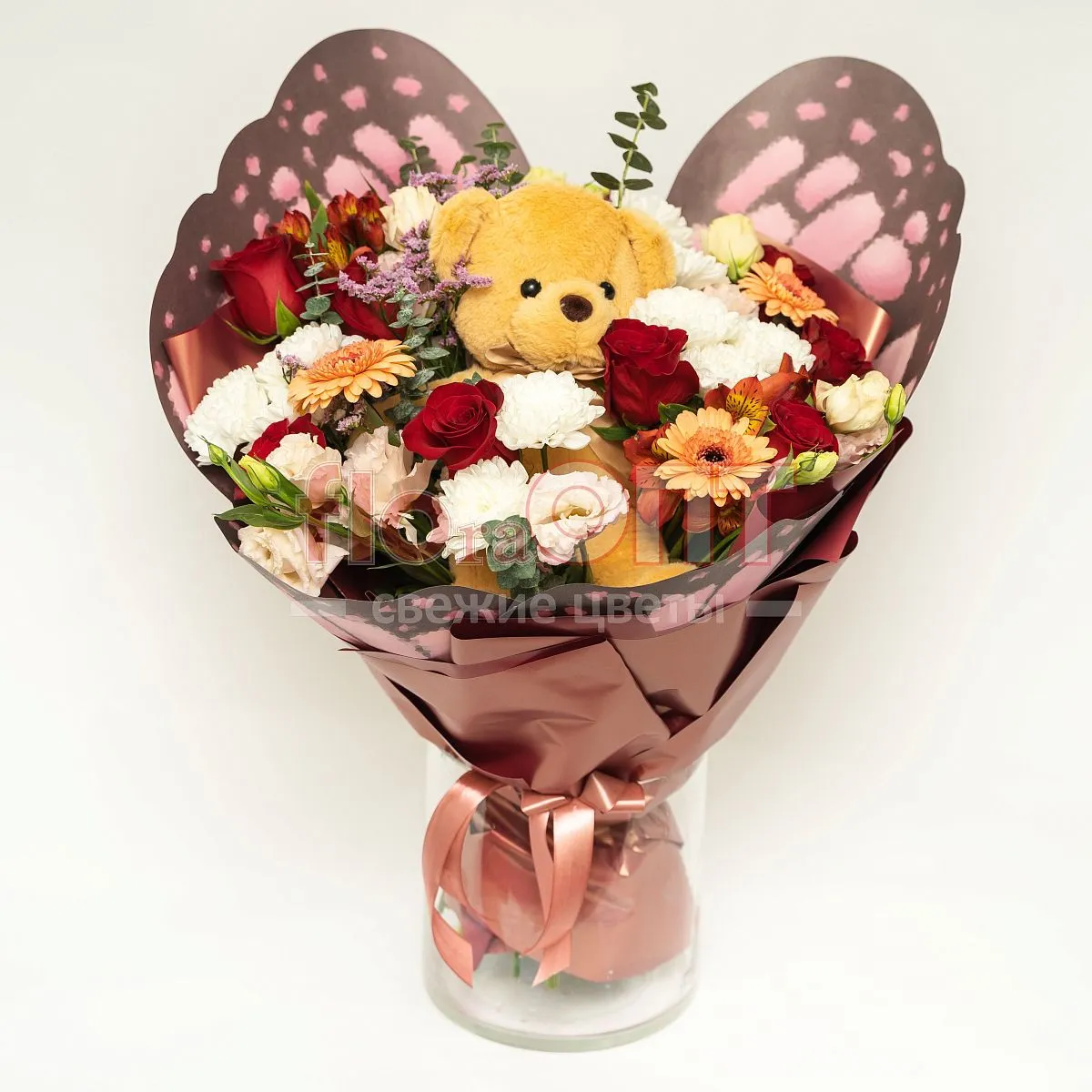 Цветы в составе Альстромерия Люкс, Гербера Мини, Лента текстиль 80 руб, Лимониум Натуральный (Роял), Пленка 250,руб, Роза Форевер 40 см, Эвкалипт Де Люкс, Эустома, Хризантема Кустовая, Декор 250 руб, Мягкая игрушка 750 руб, Расходный материал, ✓ Все цветы в наличии