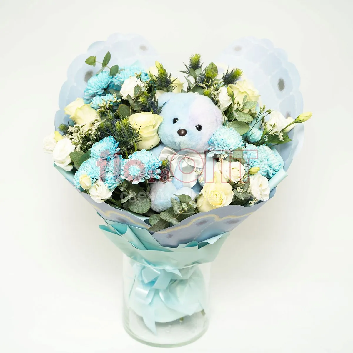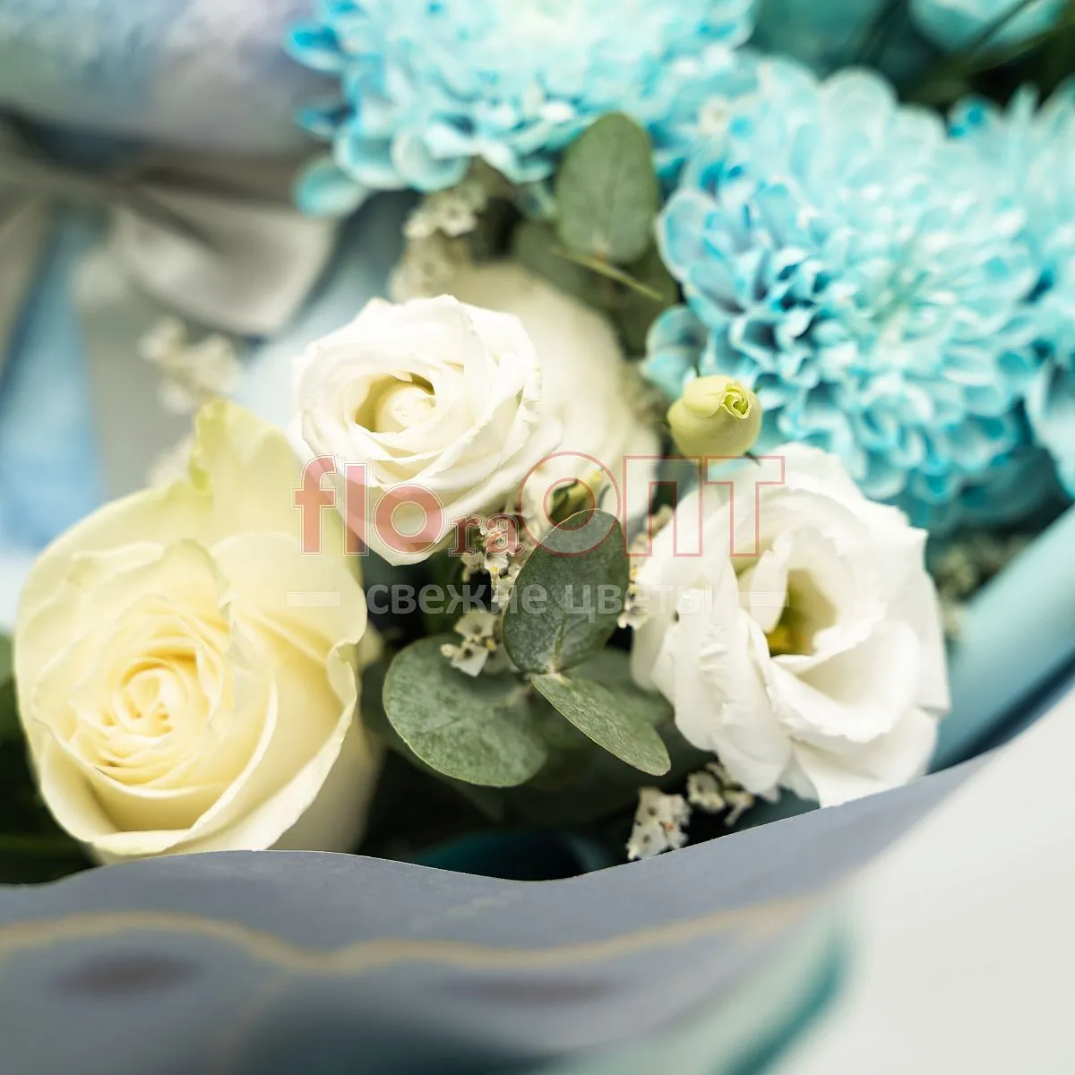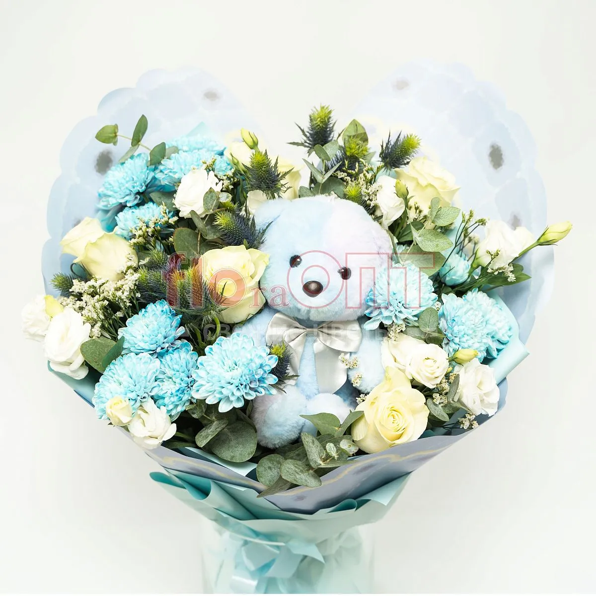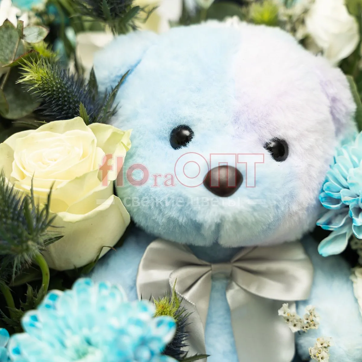 Цветы в составе Лимониум Натуральный (Роял), Пленка 250,руб, Эвкалипт Де Люкс, Эустома, Роза Микс 40 см, Декор 250 руб, Мягкая игрушка 750 руб, Эрингиум Большой, Хризантема Кустовая Крашенная, Расходный материал, ✓ Все цветы в наличии