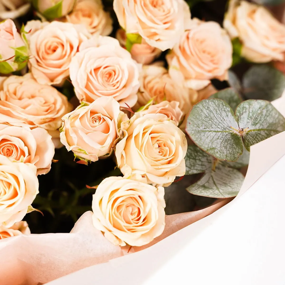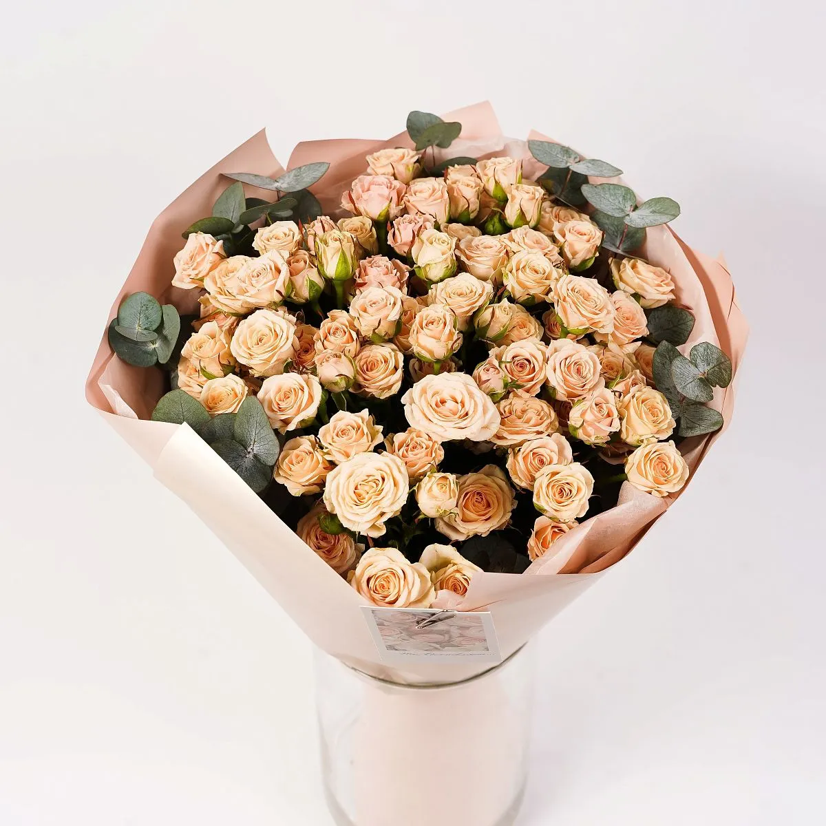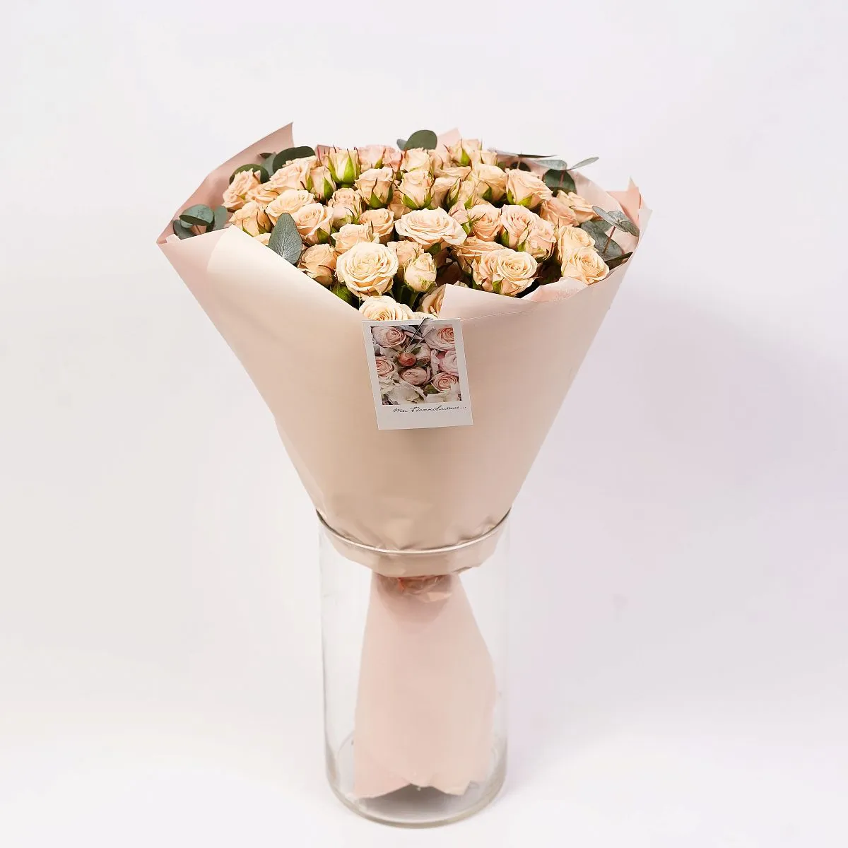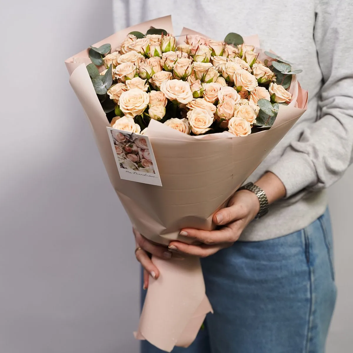 Цветы в составе Лента текстиль 100 руб, Пленка 170 руб, Роза Россия Кустовая 50 см, Эвкалипт Де Люкс, Открытка 50 руб, Бумага Тишью, Расходный материал, ✓ Все цветы в наличии