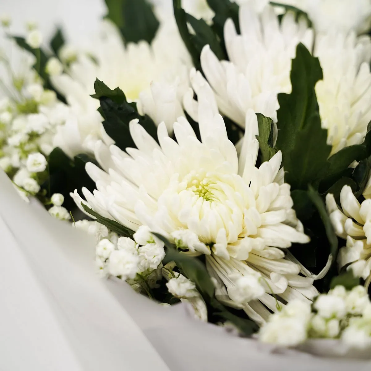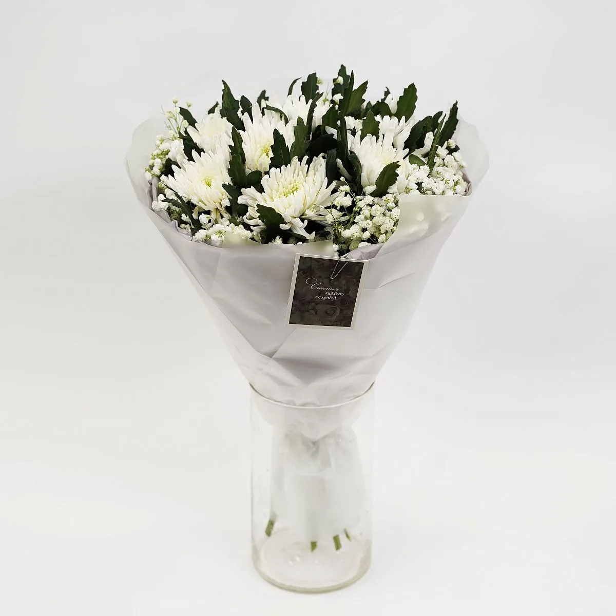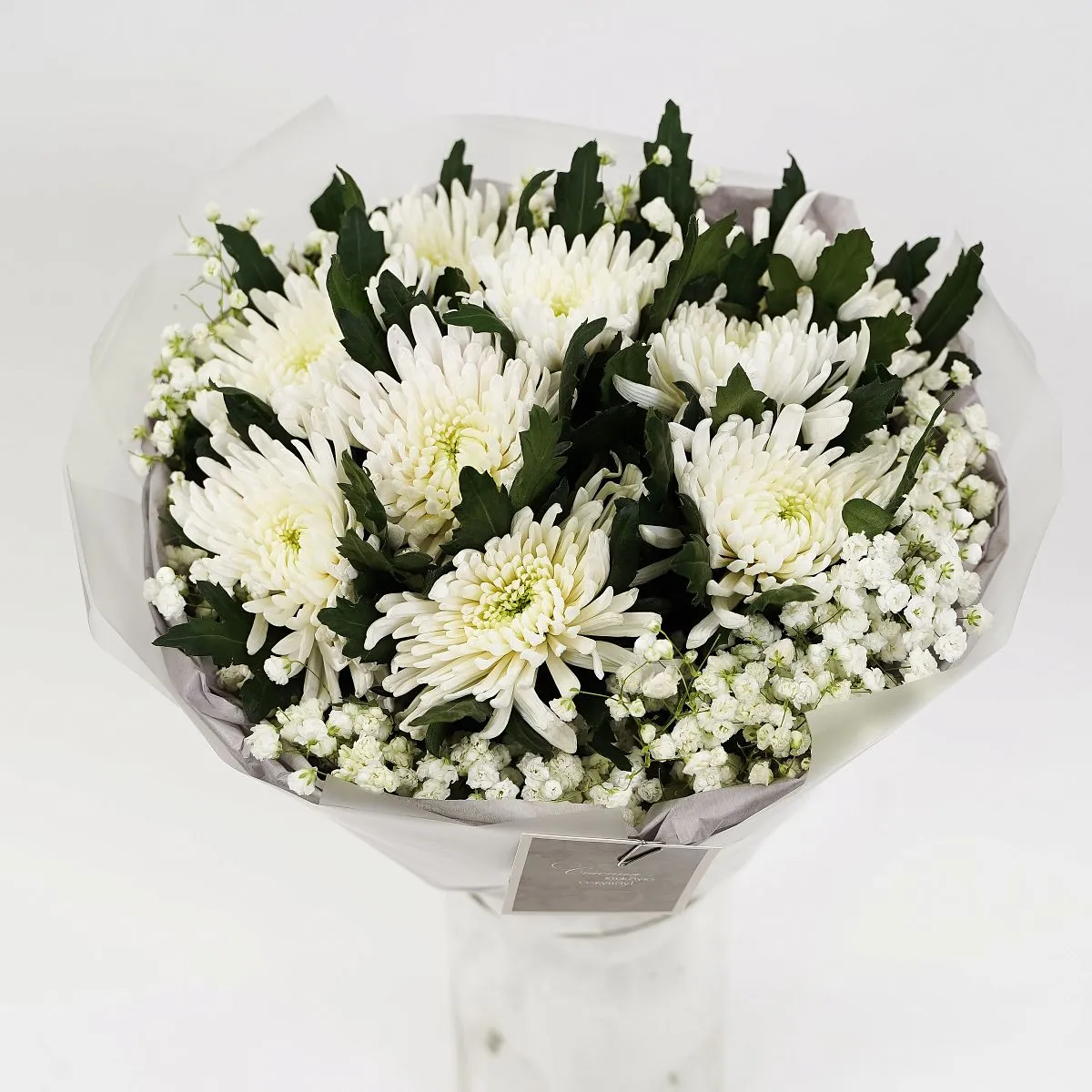 Цветы в составе Гипсофила, Лента текстиль 100 руб, Пленка 170 руб, Хризантема Одиночная Микс, Открытка 50 руб, Бумага Тишью, Расходный материал, ✓ Все цветы в наличии