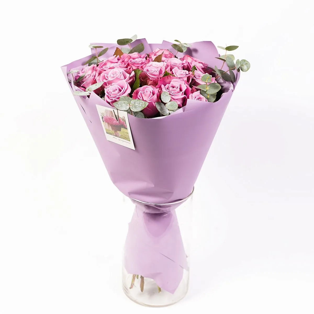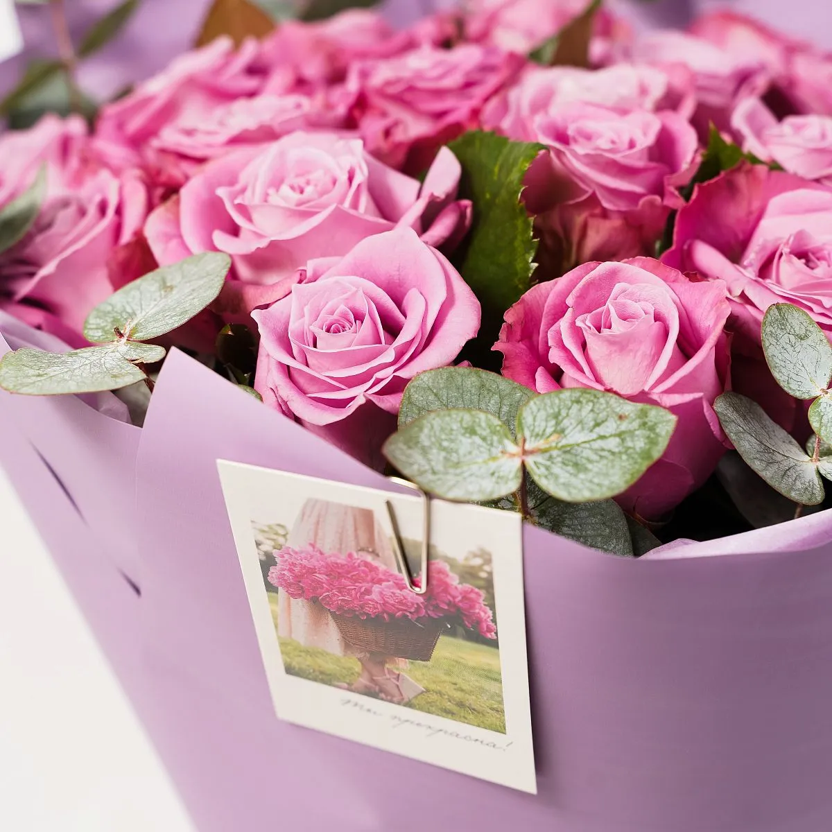 Цветы в составе Лента текстиль 100 руб, Пленка 170 руб, Эвкалипт Де Люкс, Роза Россия 50 см, Открытка 50 руб, Бумага Тишью, Расходный материал, ✓ Все цветы в наличии