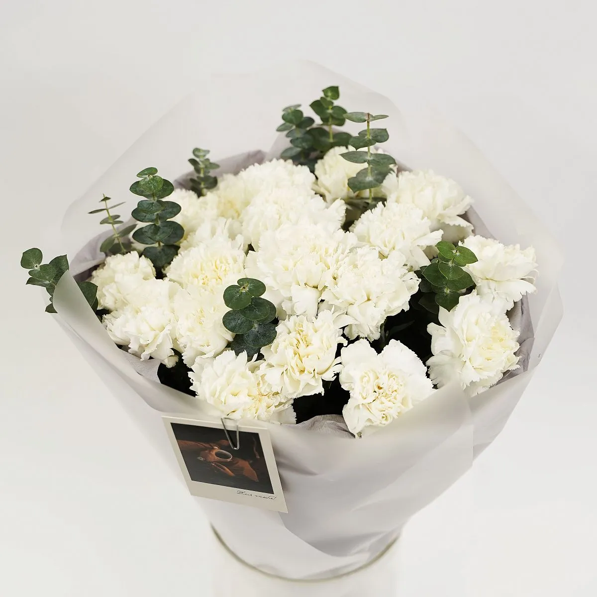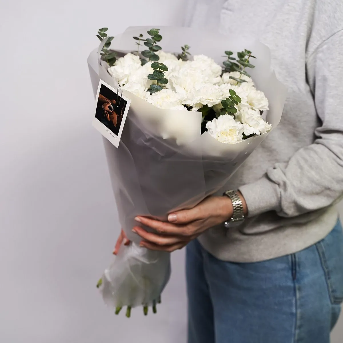 Цветы в составе Лента текстиль 100 руб, Пленка 170 руб, Эвкалипт Де Люкс, Открытка 50 руб, Гвоздика Экстра , Бумага Тишью, Расходный материал, ✓ Все цветы в наличии
