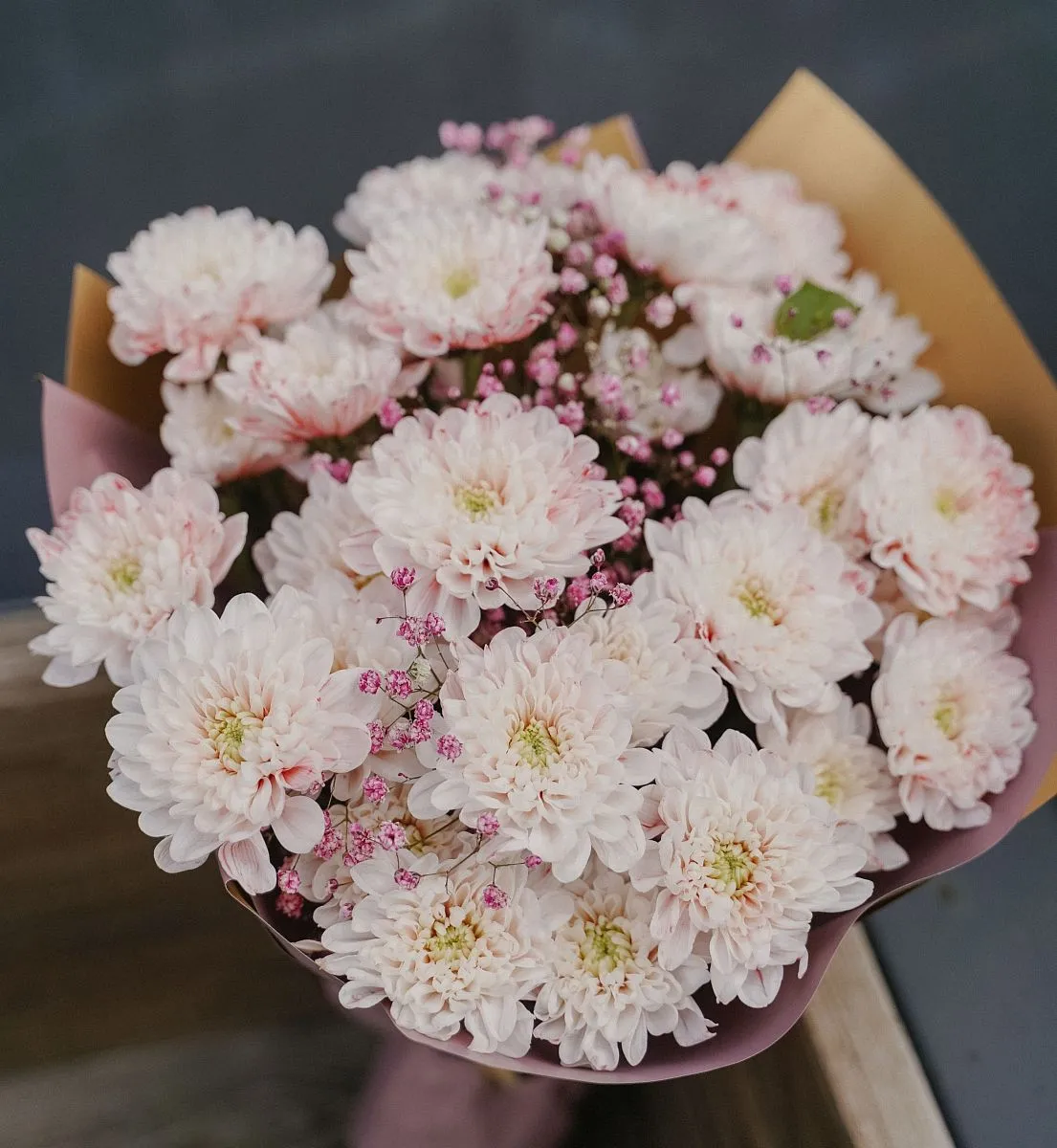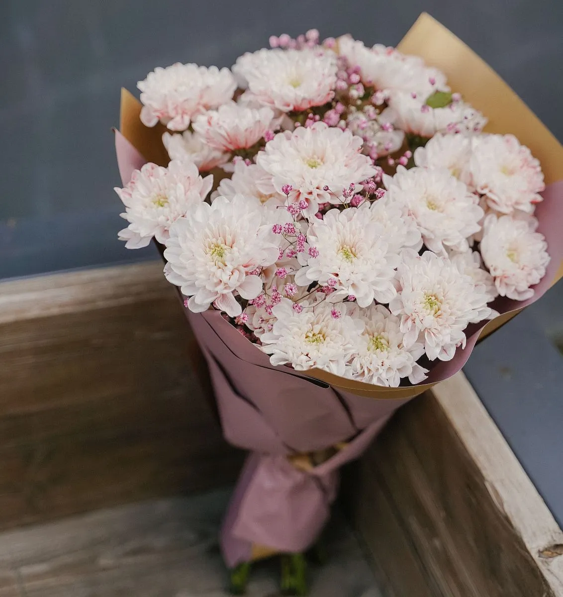 Цветы в составе Пленка матовая 320 руб, Рафия , Хризантема Кустовая Крашенная, Гипсофила Крашеная, Расходный материал, ✓ Все цветы в наличии