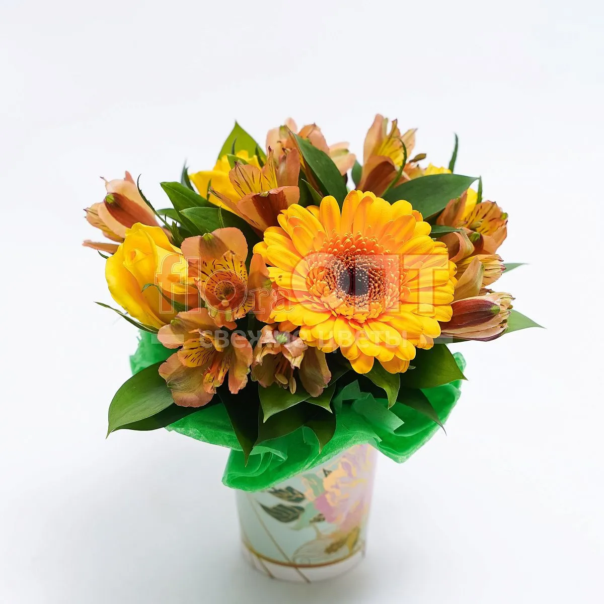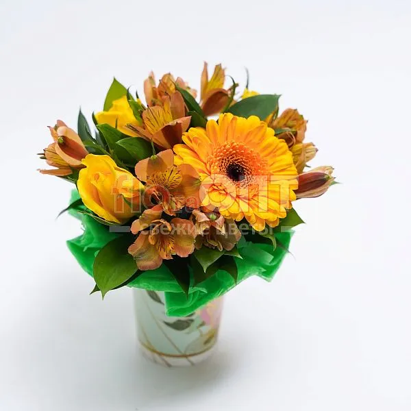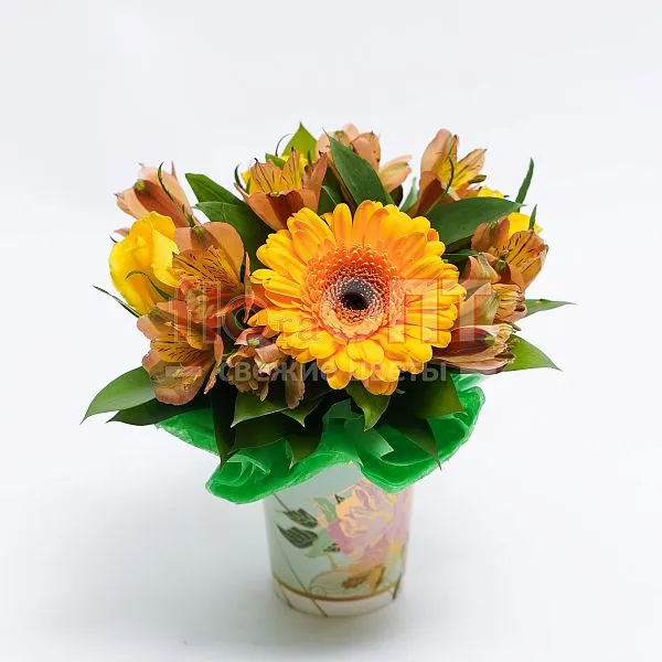 Цветочный стаканчик № 87 с желтыми розами и герберой