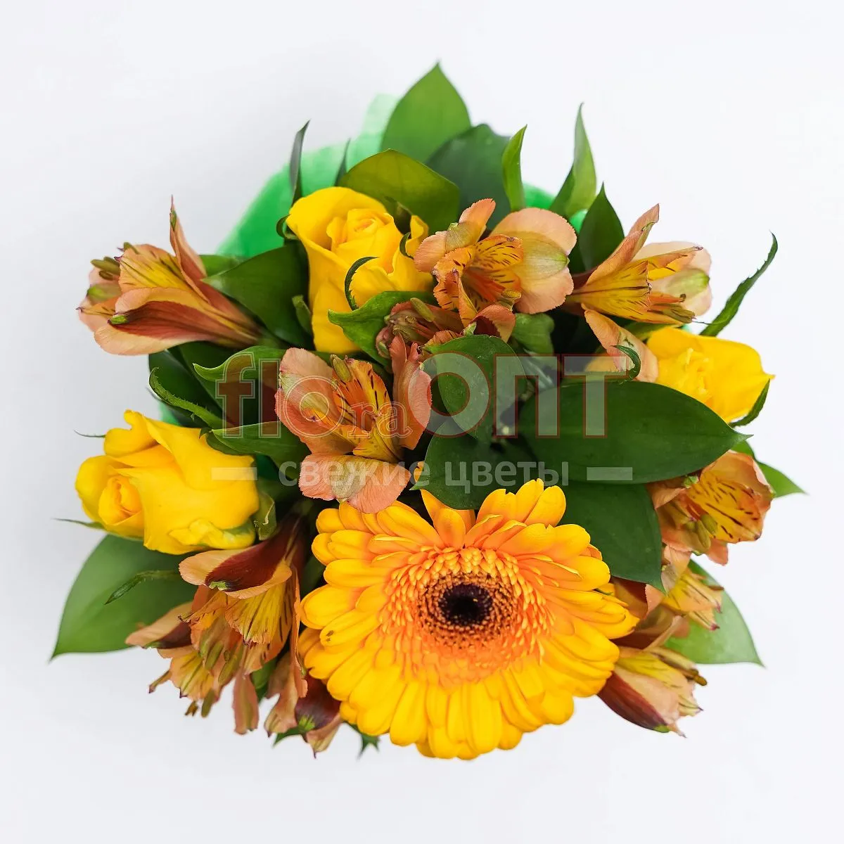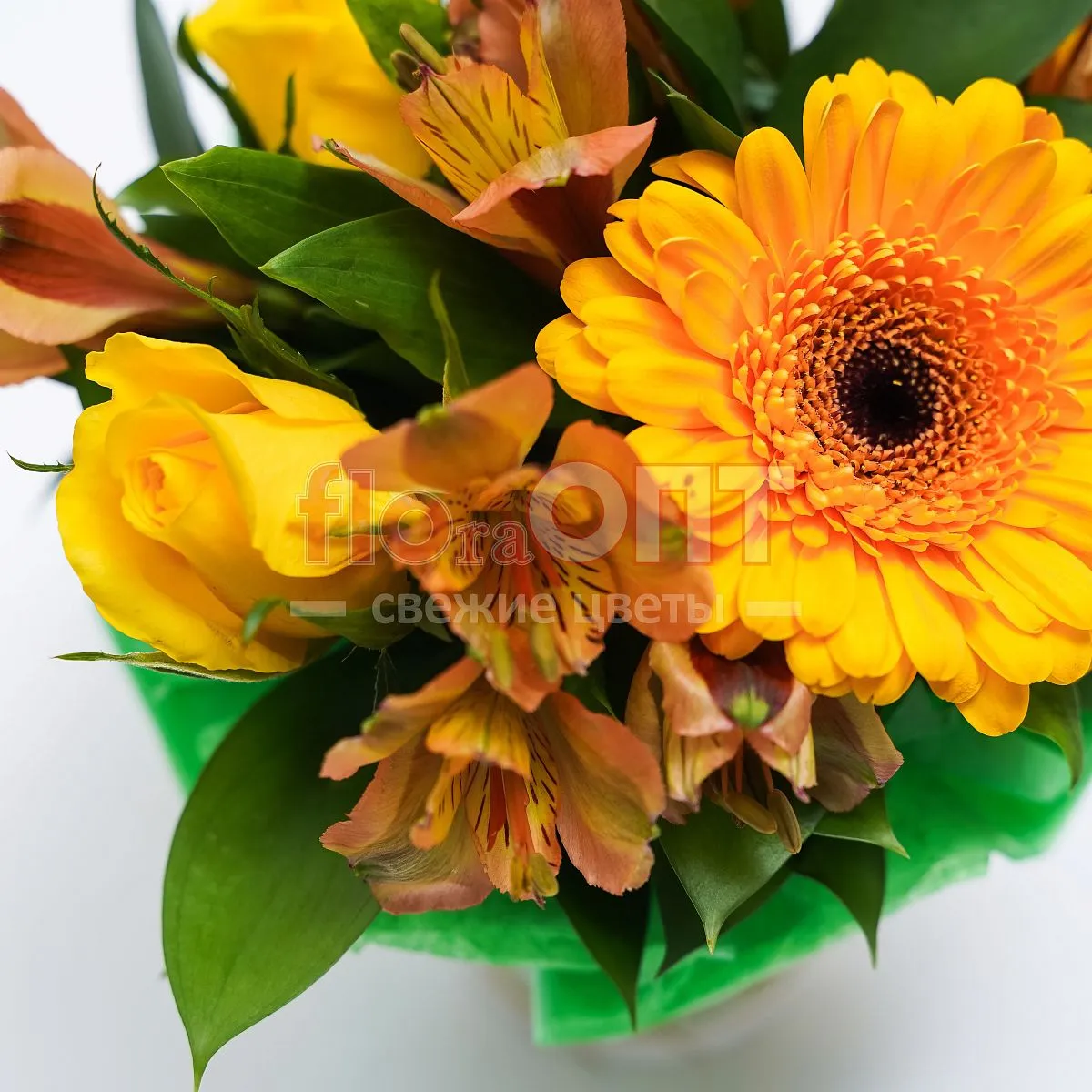 Цветы в составе Альстромерия, Гербера, Оазис , Рускус Голландия , Декор 50 руб, Бумага Тишью, ✓ Все цветы в наличии