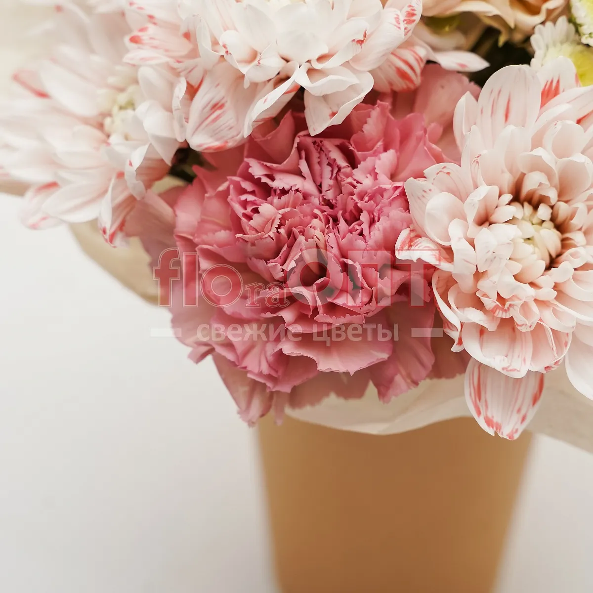 Цветы в составе Гвоздика Одиночная, Оазис , Декор 50 руб, Хризантема Кустовая Крашенная, Роза Россия Кустовая 40 см, Бумага Тишью, Расходный материал, ✓ Все цветы в наличии