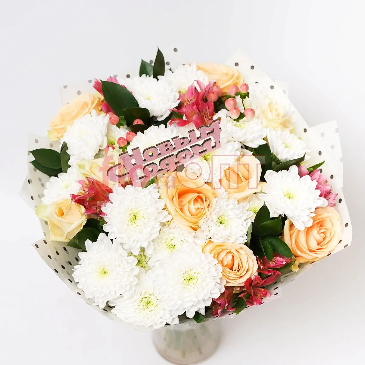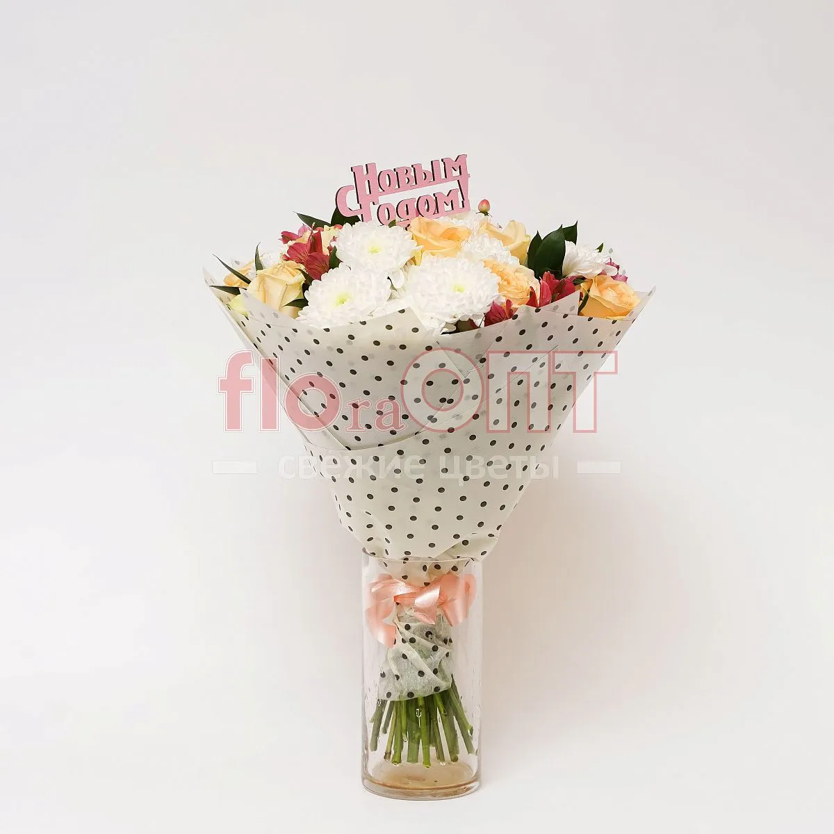 Цветы в составе Альстромерия, Лента пластиковая 30 руб, Фетр 200 руб, Гиперикум, Рускус Голландия , Хризантема Кустовая, Роза Россия 60 см , Топпер 150 руб, Расходный материал, ✓ Все цветы в наличии