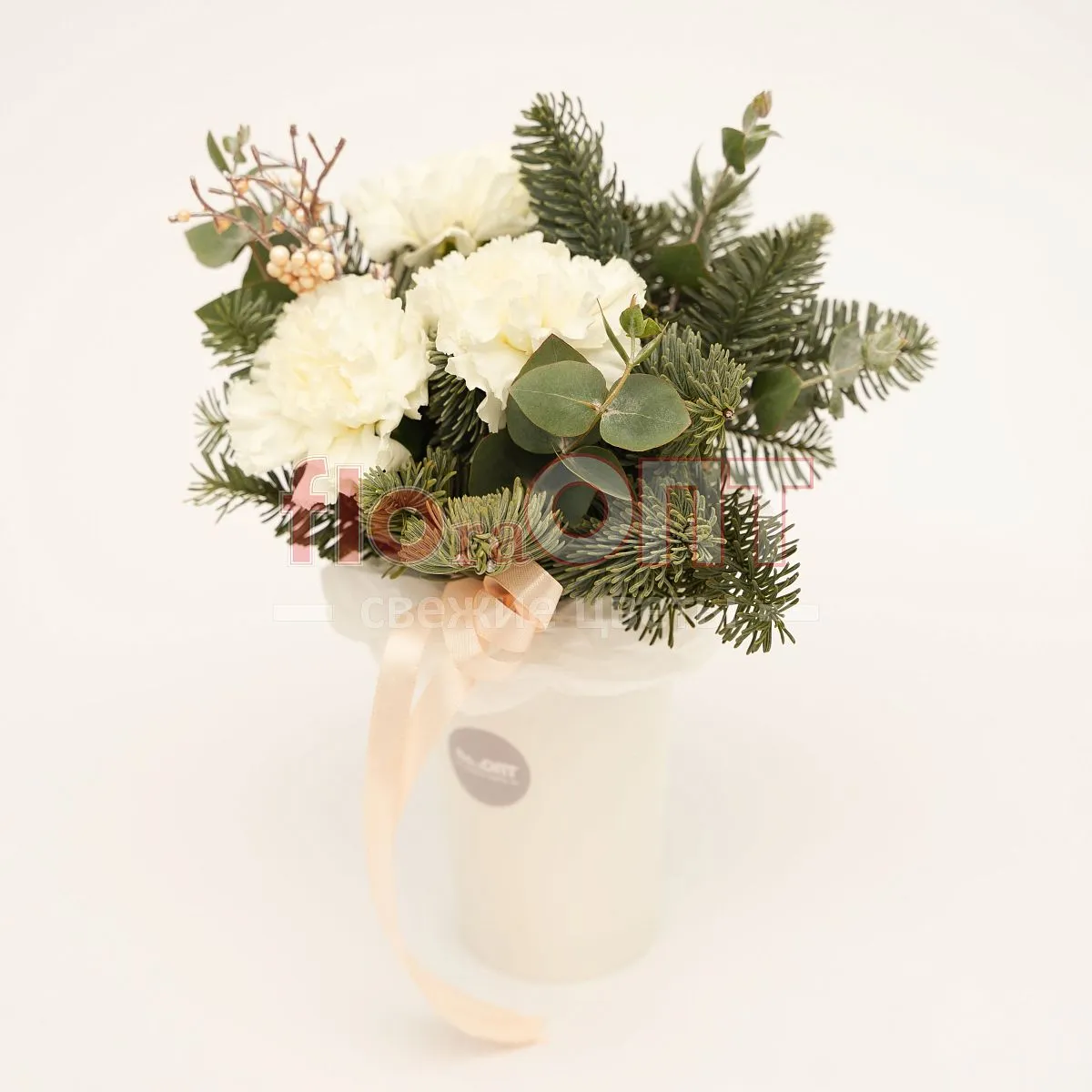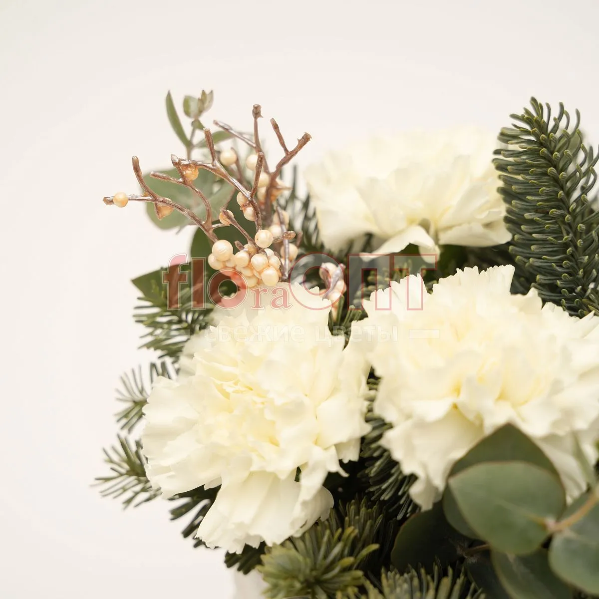 Цветы в составе Гвоздика Одиночная, Лапка Ели , Лента текстиль 80 руб, Оазис , Эвкалипт Де Люкс, Декор 200 руб, Бумага Тишью, Расходный материал, ✓ Все цветы в наличии