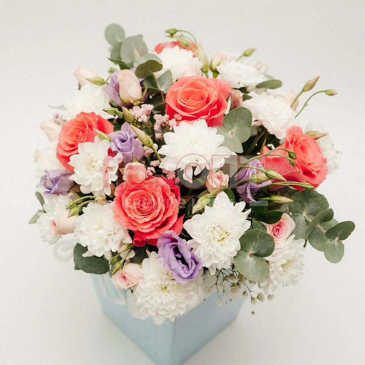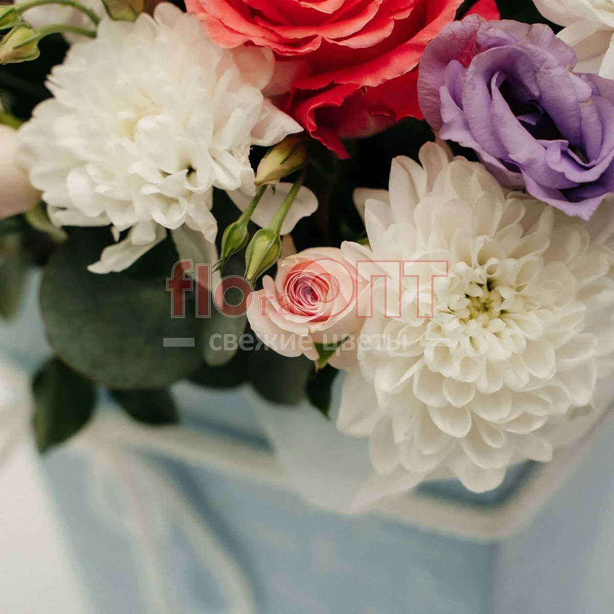 Цветы в составе Гипсофила, Оазис , Роза Эквадор Кустовая 50 см, Эвкалипт Де Люкс, Эустома, Роза Микс 40 см, Коробка 300 руб, Хризантема Кустовая , Бумага Тишью, Расходный материал, ✓ Все цветы в наличии