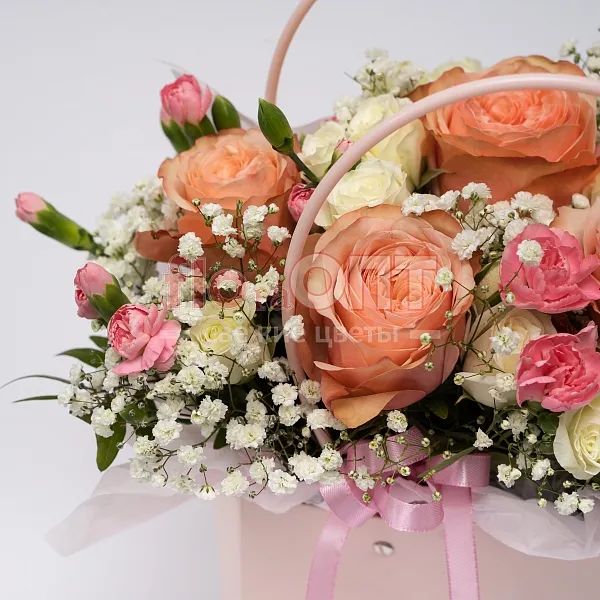 Цветы в составе Гвоздика Кустовая, Гипсофила, пусто, Оазис , Роза Китай кустовая 50 см, Роза Микс 40 см, Фисташка, Декор 350 руб, Бумага Тишью, Расходный материал, ✓ Все цветы в наличии