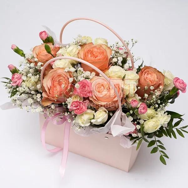 Возможна незначительная замена элементов композиции. Если какого-то цветка или оттенка, как на фотографии, не окажется в салонах, то флорист предложит вам варианты и пришлёт фото на выбор в WhasApp.