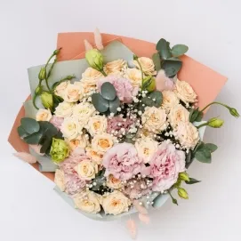 Розовые. Хорошо смотрится с цветами настолько же спокойных оттенков. С чем сочетать розы в букете, так это с лилиями, чубушником, ирисами или гиацинтами. Букет идеален для свидания, романтического ужина или на роль букета невесты. Оформить ансамбль можно в шляпную коробку или корзину.
