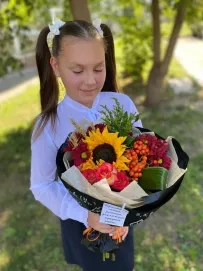 Например, первокласснику не стоит выбирать массивные и высокие цветы. Как минимум, ваше чадо не будет видно на фотографиях за обилием цветов да и удобно ребенку небудет.